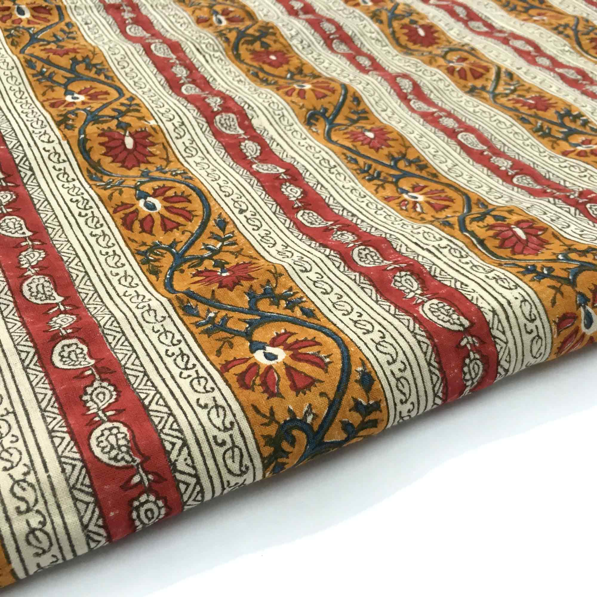 Fair Trade Striped Kalamkari Fabric in Red Blue and Mustard