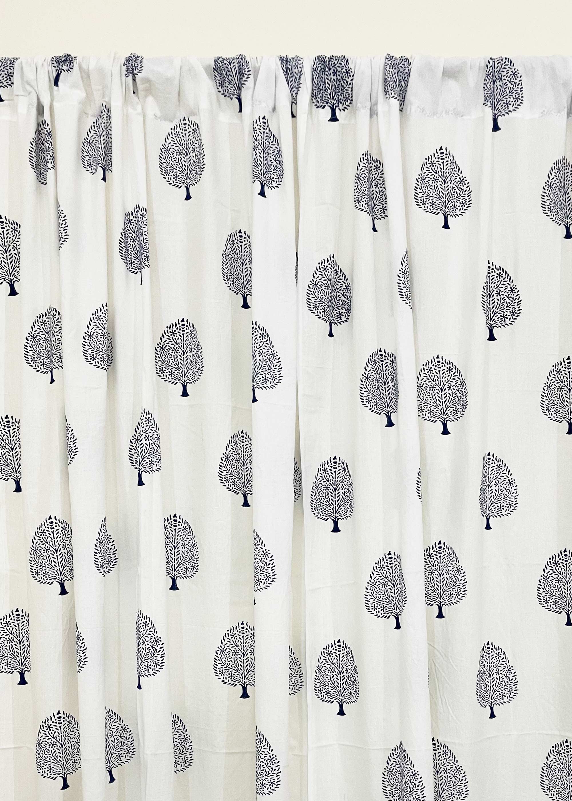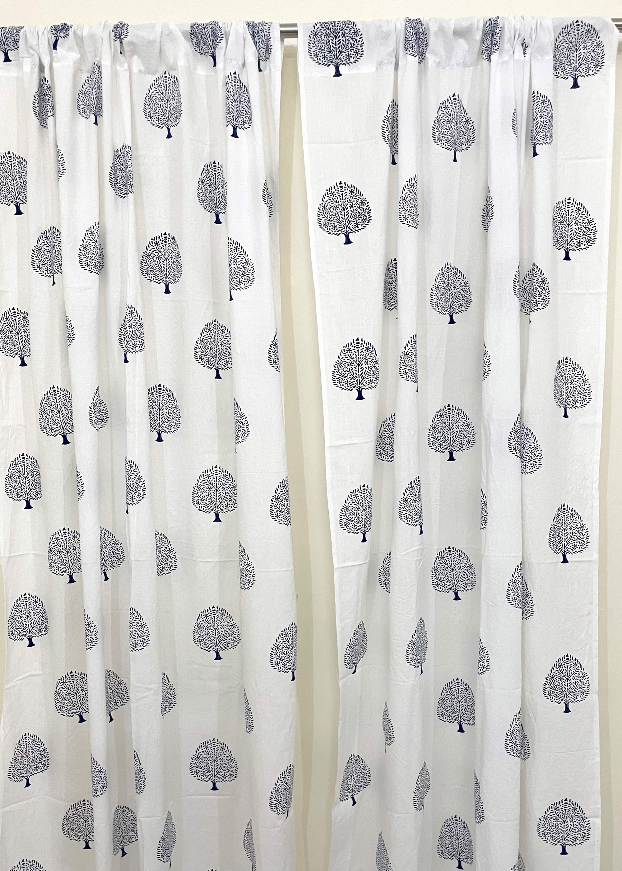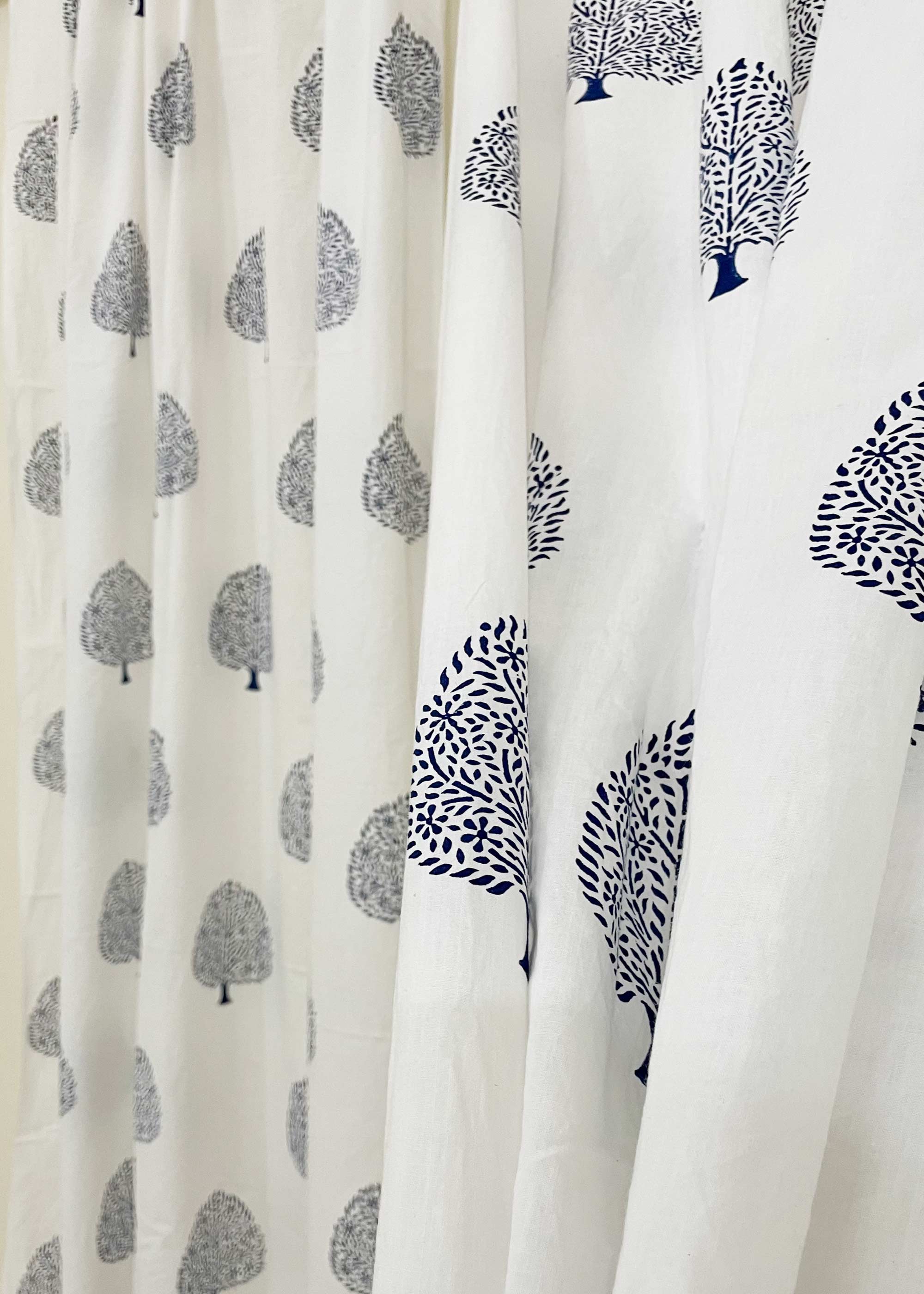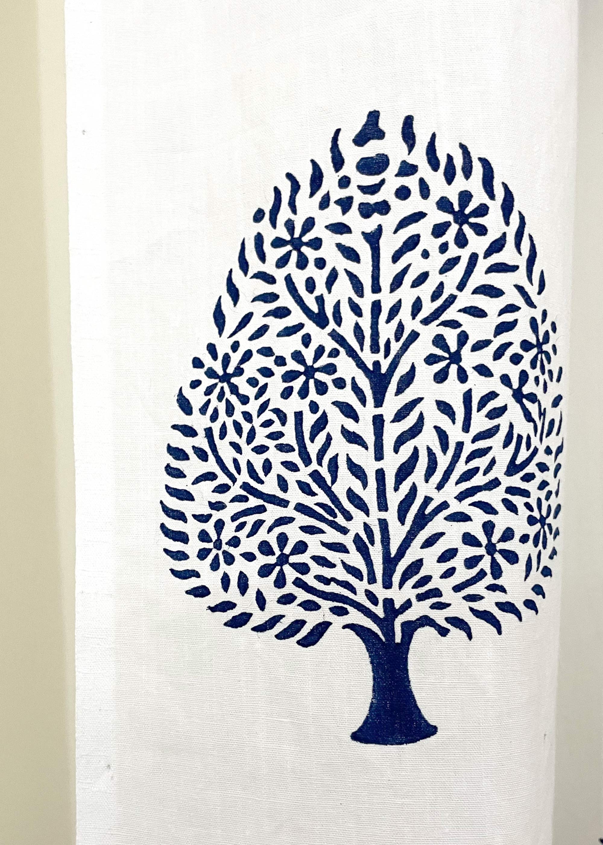 Introducing the Tree of Life Hand Block Printed cotton curtain panels. These beautiful curtains feature a vibrant indigo Tree of Life design on a crisp white background, hand block printed on a soft cotton organic fabric.