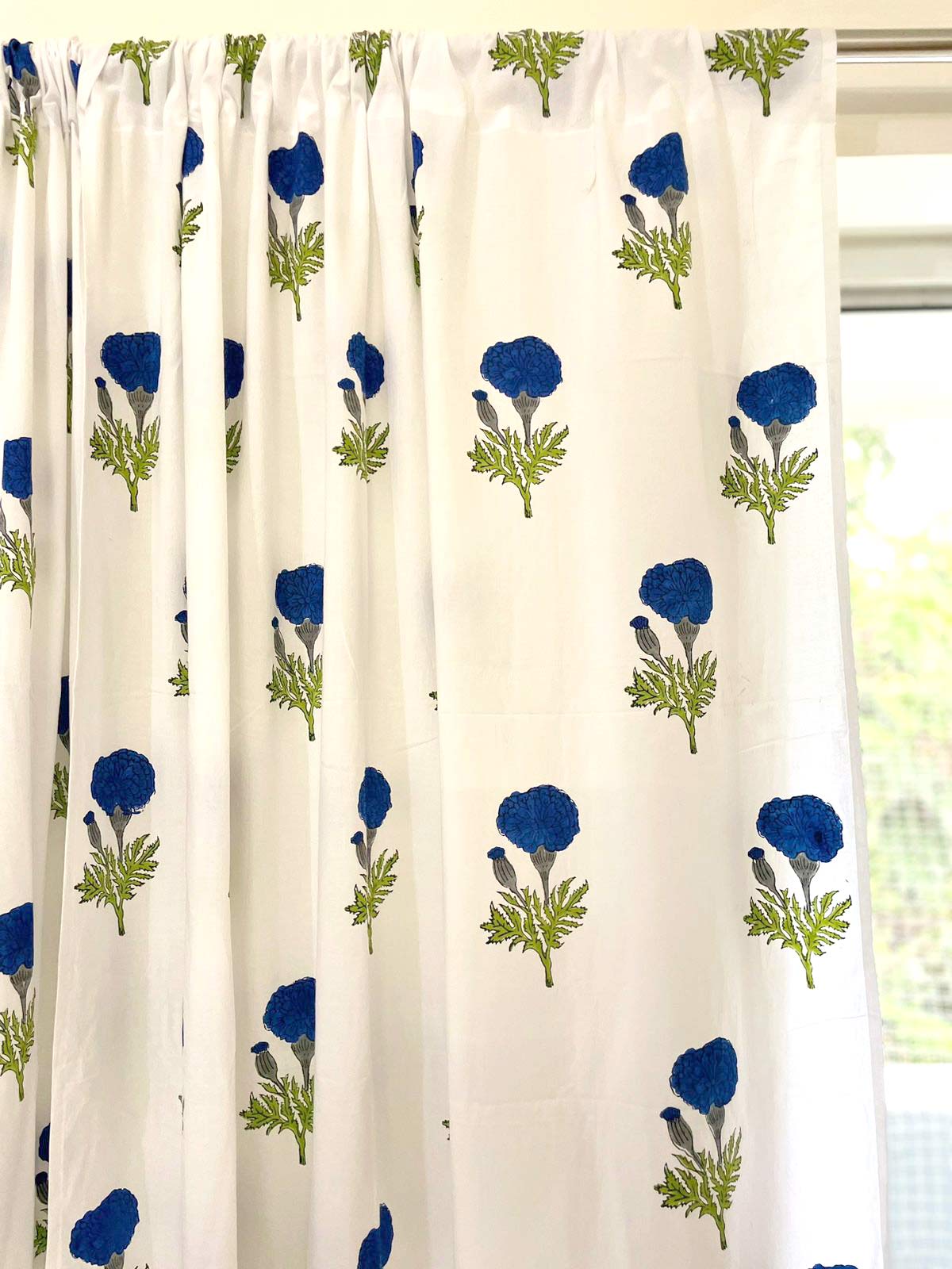Blue and White Marigold Hand Block Printed Curtain Panels
