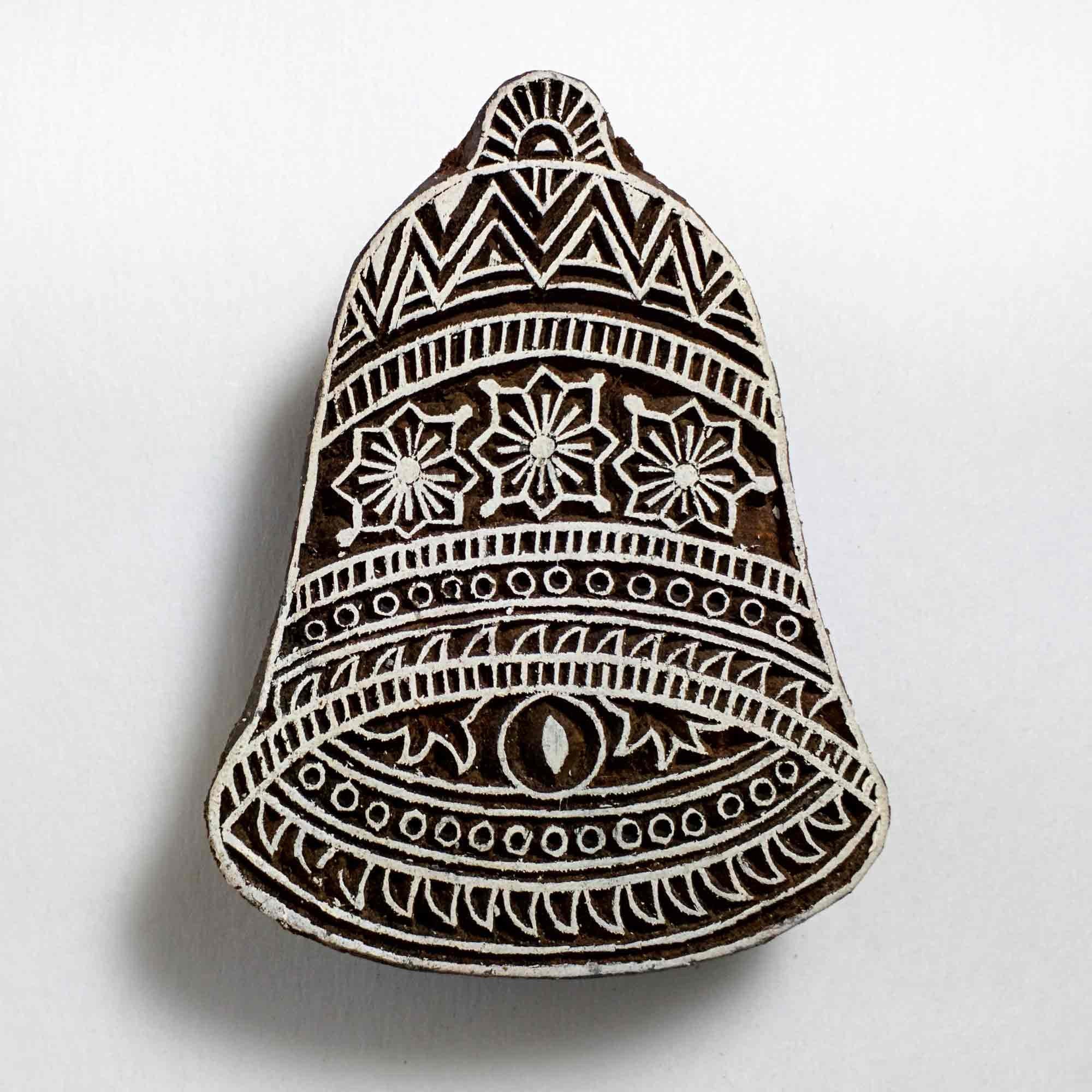 Wood block printing stamp - Christmas bell with intricate carving.