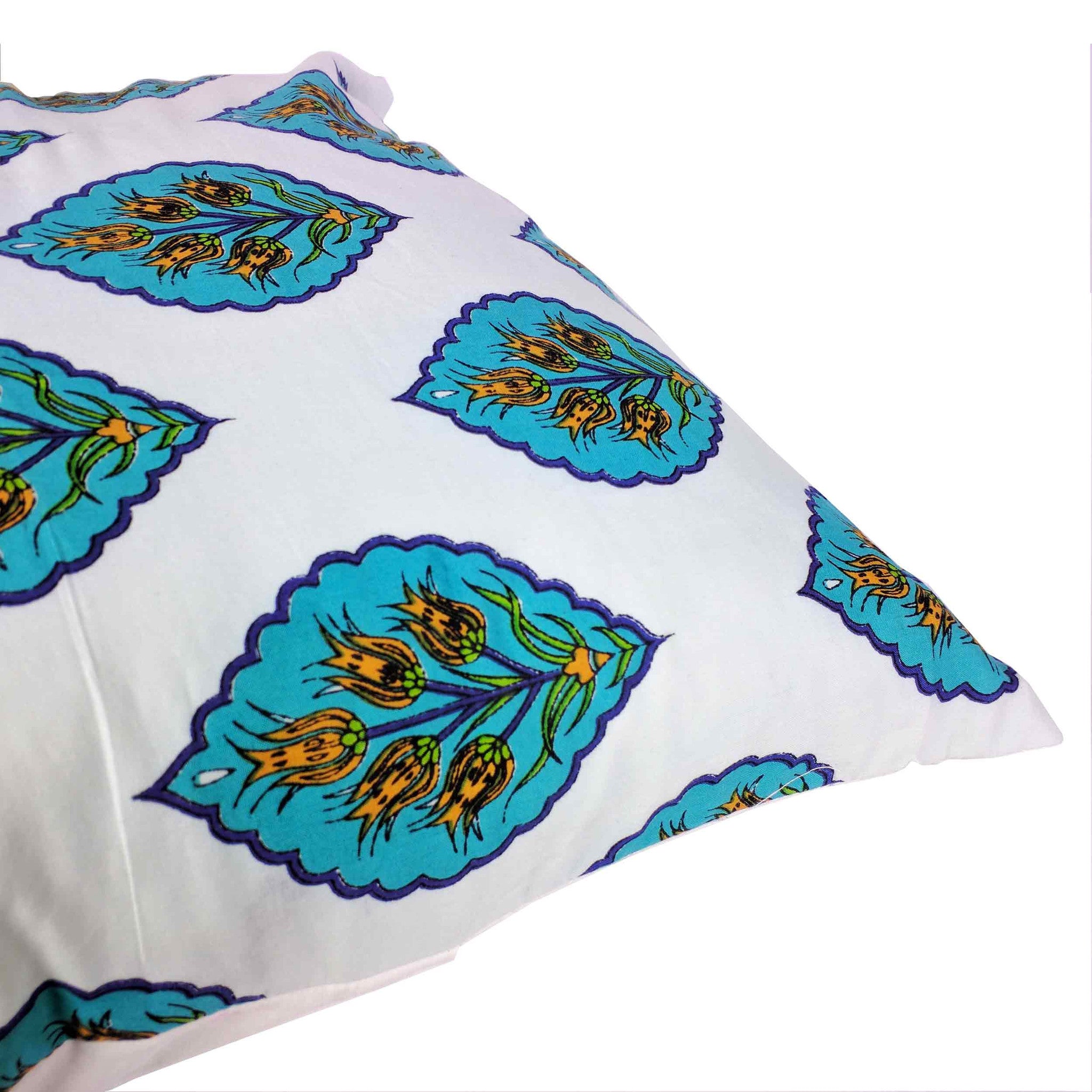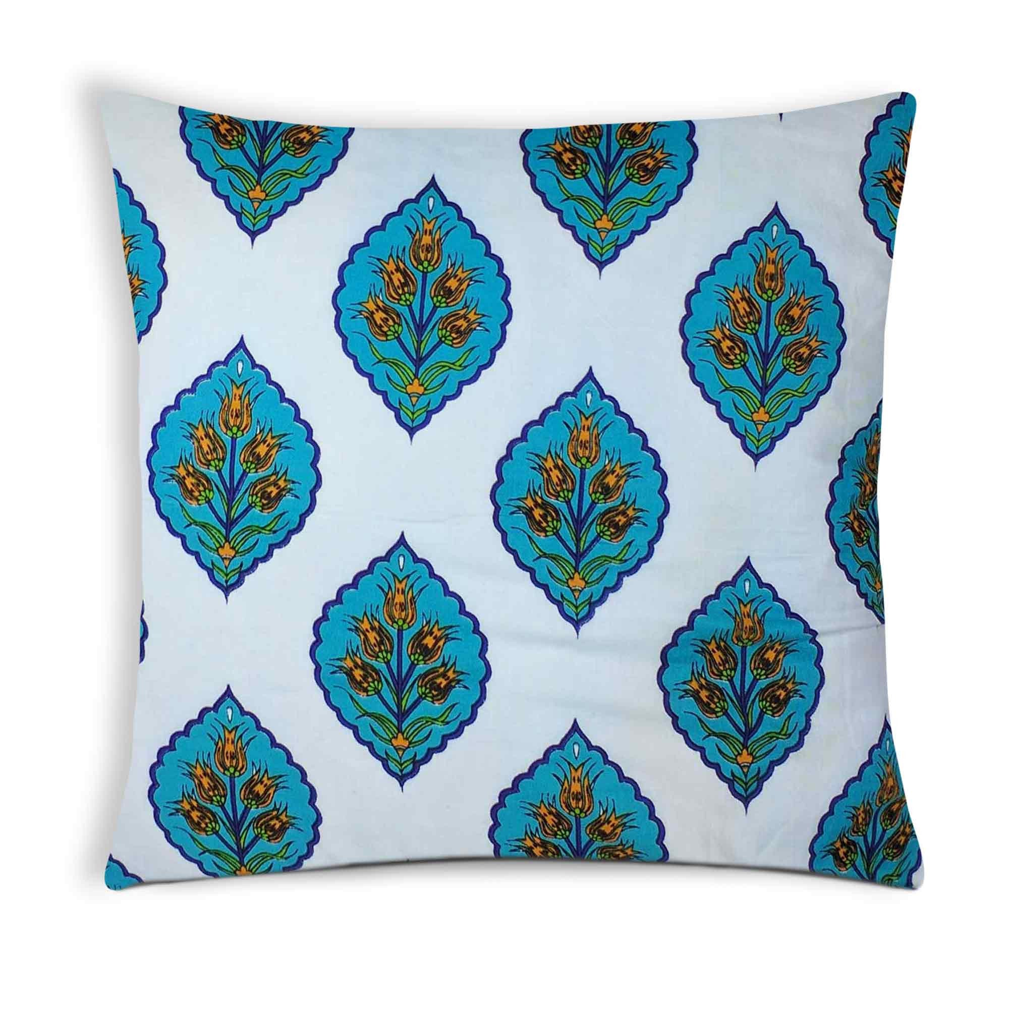 Printed cotton cushion cover in white and teal floral damask. 100% cotton pillow cover has a soft cotton lining that is well interlocked to avoid any fraying use-after-use.